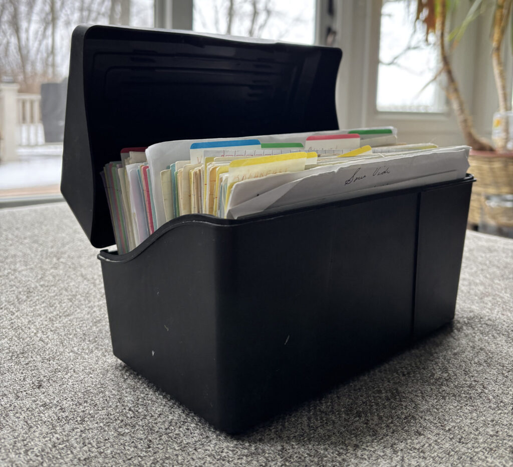 Over the years, mom would field requests for her recipes. She often shared the ingredients and instructions from memory via phone call, email, or text. However, she also had them safely captured, either as a clipping or on recipe cards – all of which can be found in her black recipe box.